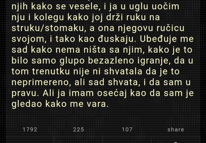 "Djevojka je išla na okupljanje sa firmom. Neko objavi video snimak svih njih kako se vesele, i ja u uglu uočim nju i kolegu kako joj drži ruku na struku/stomaku, a ona njegovu ručicu svojom, i tako kao đuskaju.