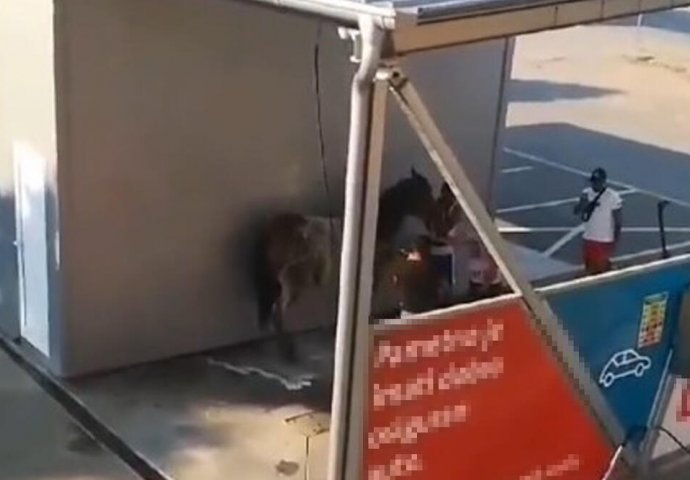 Momci koji najvjerovatnije žive u blizini, došli su u perionicu ni manje više nego sa konjem.