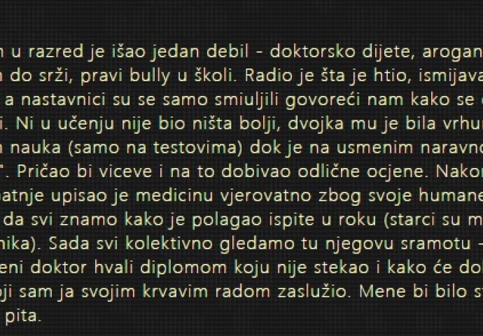 Sa mnom u razred je išao jedan debil - doktorsko dijete, arogantan, pokvaren do srži, pravi bully u školi.