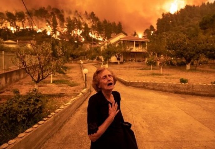 Fotografija starije žene koja očajno stoji pred svojom kućom, SOOC fotografa, Konstantinosa Cakalidisa iz Guvesa, u vrijeme kada je požar stigao do sela, prikazuje momenat košmarne situacije koja vlada na prelijepom ostrvu.