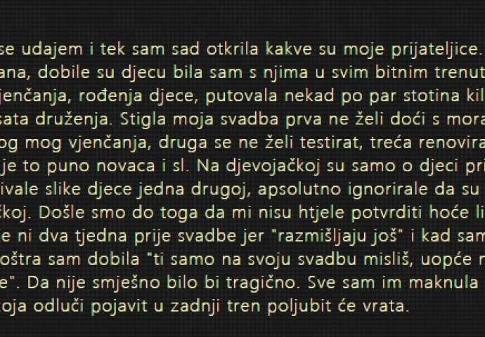 Došle smo do toga da mi nisu htjele potvrditi hoće li doći na vjenčanje ni dva tjedna prije svadbe jer "razmišljaju još" i kad sam postala oštra sam dobila "ti samo na svoju svadbu misliš, uopće ne misliš na druge". Da nije smješno bilo bi tragično. Sve sam im maknula s popisa ako se koja odluči pojavit u zadnji tren poljubit će vrata.