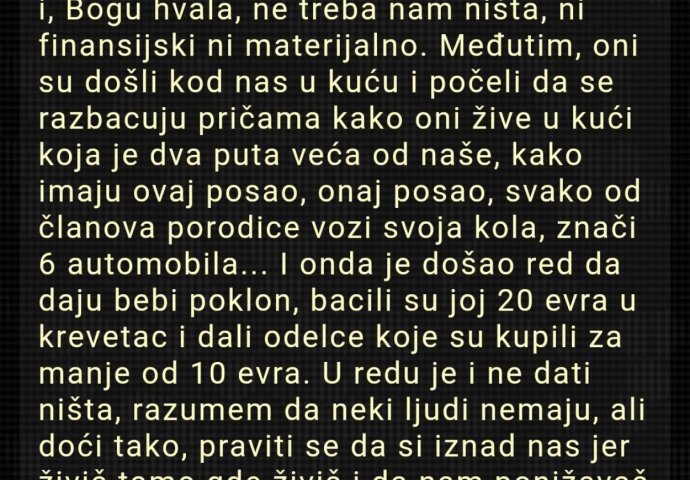 U redu je i ne dati ništa, razumijem da neki ljudi nemaju, ali doći tako, praviti se da si iznad nas jer živiš tamo gdje živiš i da nam ponižavaš to što imamo, e to je već čist bezobrazluk i nepoštovanje."