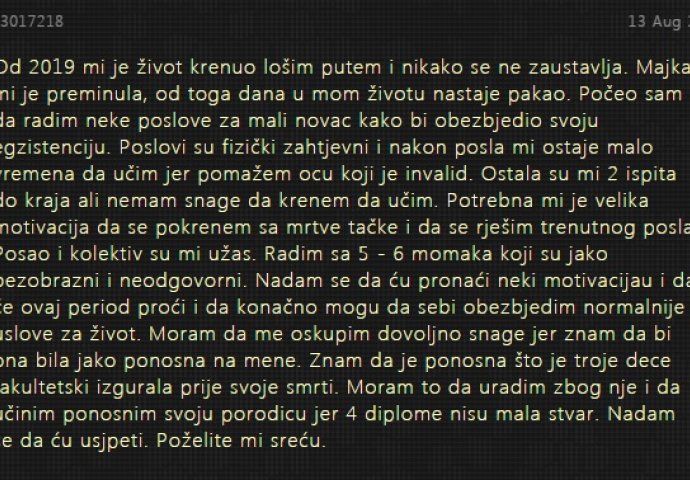 Znam da je ponosna što je troje djece fakultetski izgurala prije svoje smrti. Moram to da uradim zbog nje i da učinim ponosnim svoju porodicu jer 4 diplome nisu mala stvar. Nadam se da ću uspjeti. Poželite mi sreću."