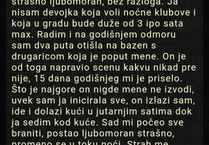 Sad mi počeo sve braniti, postao ljubomoran strašno, promijenio se u toku noći. Strah me takvog odnosa, umorna sam."