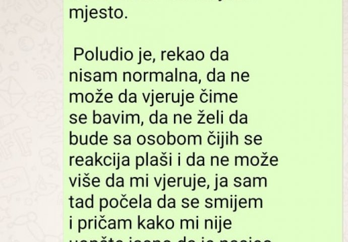 Poludio je, rekao da nisam normalna, da ne može da vjeruje čime se bavim, da ne želi da bude sa osobom čijih se reakcija plaši i da ne može više da mi vjeruje, ja sam tad počela da se smijem i pričam kako mi nije uopšte jasno da je nasjeo na tu glupu priču, da se samo šalim i da to nikad ne bih uradila, i tada se smirio.