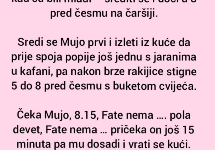 Sredi se Mujo prvi i izleti iz kuće da prije spoja popije još jednu s jaranima u kafani, pa nakon brze rakijice stigne 5 do 8 pred česmu s buketom cvijeća.