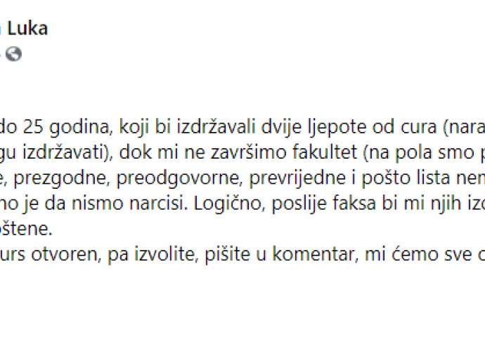 Traže se dva momka do 25 godina, koji bi izdržavali dvije ljepote od cura (naravno, podrazumijeva se da i sami sebe mogu izdržavati), dok mi ne završimo fakultet (na pola smo puta). Mi smo prepametne, prelijepe, prezgodne, preodgovorne, prevrijedne i pošto lista nema kraja, da se zaustavimo ovdje. Bitno je da nismo narcisi. Logično, poslije faksa bi mi njih izdržavale, jer smo, eto, prije svega prepoštene.