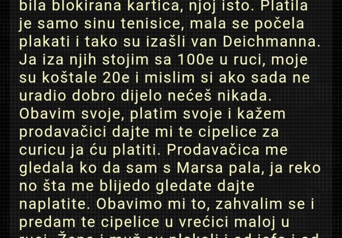 Ja iza njih stojim sa 100e u ruci, moje su koštale 20e i mislim si ako sada ne uradio dobro dijelo nećeš nikada. Obavim svoje, platim svoje i kažem prodavačici dajte mi te cipelice za curicu ja ću platiti. Prodavačica me gledala ko da sam s Marsa pala, ja reko no šta me blijedo gledate dajte naplatite.