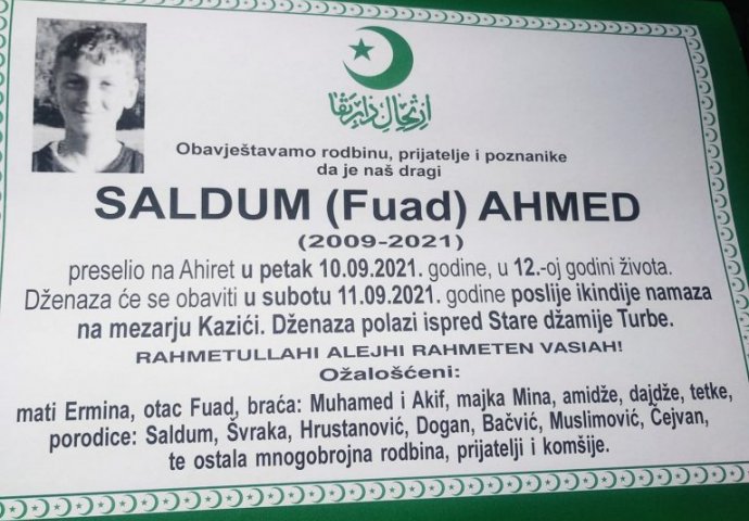 Tužnog srca i s bolom u duši obavještavamo rodbinu, komšije i prijatelje da je naš dragi Saldum (Fuada) Ahmed, dana 10.09.2021. godine, u 12-oj godini života preselio na ahiret. Dženaza će se obaviti u subotu 11.09.2021., poslije ikindije namaza na mezarlucima Kazići.