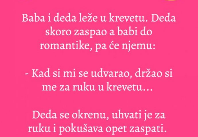Baba i deda leže u krevetu. Deda skoro zaspao a babi do romantike, pa će njemu: