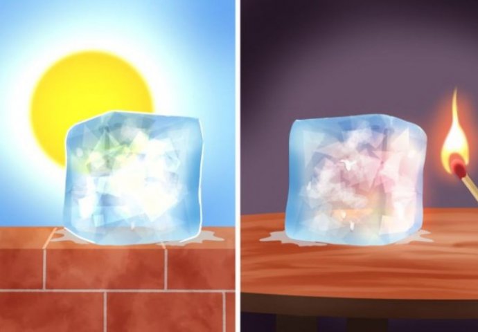 Šta mislite koja kocka leda će se prije otopiti, ova koja je izložena suncu ili ova koju pokušavamo šibicom otopiti?