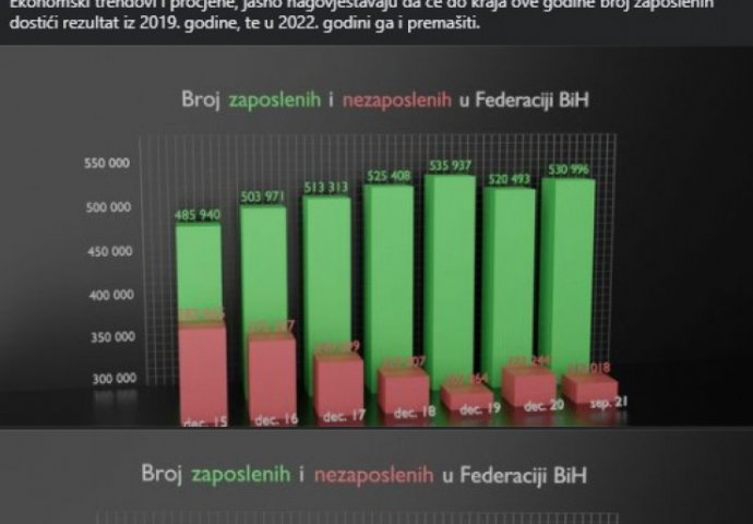 - Ove dvije grafike prikazuju rast zaposlenosti u Federaciji BiH u vrijeme aktuelne Vlade na čijem je čelu premijer Fadil Novalić. Da nije bilo pandemije, zaposlenost, koja je u 2019. godini dosegnula vrhunac, sasvim sigurno bi bio nastavila da raste u istom tempu, od 10 do 15 hiljada novih radnih mjesta godišnje.