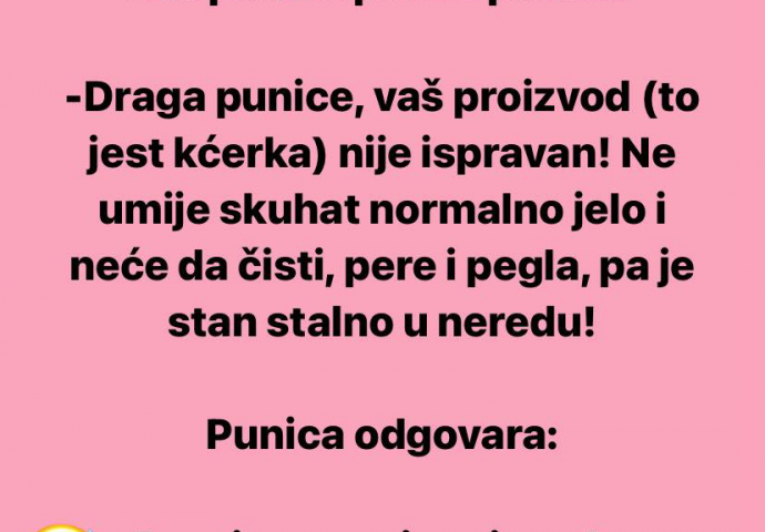 -Draga punice, vaš proizvod (to jest ćerka) nije ispravan! Ne umije skuhat normalno jelo i neće da čisti, pere i pegla, pa je stan stalno u neredu!