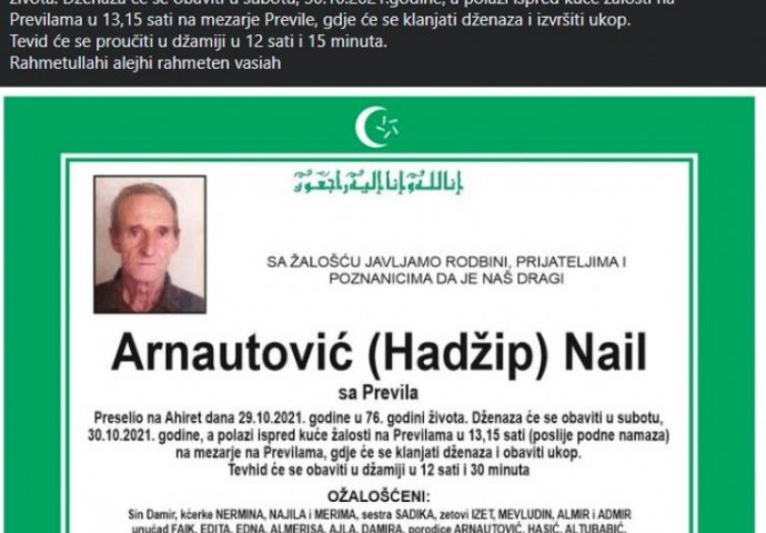 Mustafa Kovač, direktor pogrebnog preduzeća "Selam" d.o.o. iz Srebrenika, potvrdio je da je danas uoči dženaze rahmetli Nailu Arnautoviću iz mjesta Previla kod Srebrenika, nažalost, preminuo i njegov sin Damir, kako prenosi Avaz.