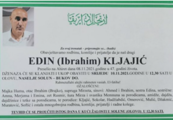 Nastavnik u OŠ “Porodice ef. Ramić”, Edin Kljajić, preminuo je u ponedjeljak, 8. novembra 2021. godine, u svojoj 47. godini života.