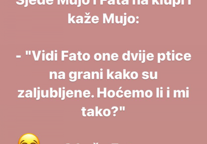 VIC: Ptice na grani Kiosk 13.11.21. 09:03 Sjede Mujo i Fata na klupi i kaže Mujo: Sjede Mujo i Fata na klupi i kaže Mujo: - "Vidi Fato one dvije ptice na grani kako su zaljubljene. Hoćemo li i mi tako?" A kaže Fata: - "A ne znam Mujo, vjerovatno će grana puknut!"