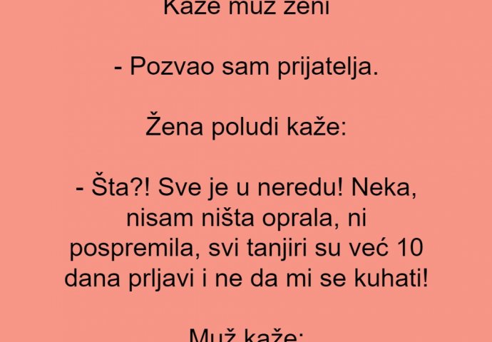 - Šta?! Sve je u neredu! Neka, nisam ništa oprala, ni pospremila, svi tanjiri su već 10 dana prljavi i ne da mi se kuhati!