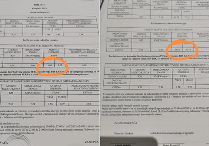 Tako je cijena manjih dnevnih tarifnih stavova u prošlom ugovoru ove firme bila 9,02 KM po kilovat satu, dok je u novom ugovoru ta cijena 26,74 KM. Cijena kilovat sata električne energije za veći dnevni tarifni stav u prošlom ugovoru bila je 13,08 KM, dok je u novom ugovoru ta cijena povećana na 39,66 KM.