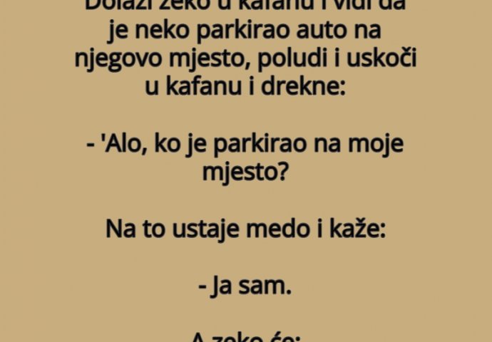 Vic dana: ZEKO I MEDO Kiosk 16.12.21. 08:11 - Dolazi zeko u kafanu i vidi da je neko parkirao auto na njegovo mjesto, poludi i uskoči u kafanu i drekne: - 'Alo, ko je parkirao na moje mjesto? Na to ustaje medo i kaže: - Ja sam. A zeko će: - Auuu, al' si ga parkirao, svaka ti čast!