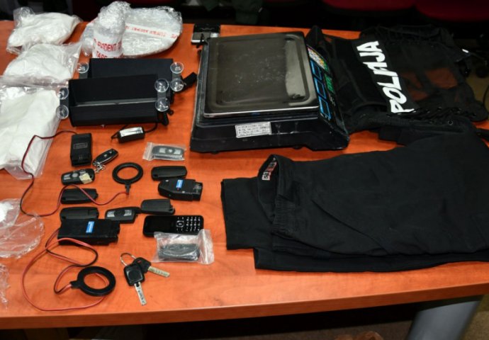 Policajci su tokom pretresa pronašli i oduzeli: 10,39 kilograma materije bijele boje koja svojim izgledom asocira na opojnu drogi spid, 4,8 kilograma marihuane ,dvije precizne vage za mjerenje, mašinu za vakumiranje te šest automatskih puški,pištolj, dva prigušivača, 11 ručnih bombi, rasprskavajuća mina, 13 električnih detonatorskih kapsli, 2 trotirska metka, 4 ručna bacača raketa (zolje), oko 1 kg plastičnog eksploziv, više okvirova za vatreno oružje, oko 600 komada municije različitog kalibra, uređaj za kodiranje ključeva, policijska uniforma, policijski blinkeri i više mobilnih telefona.