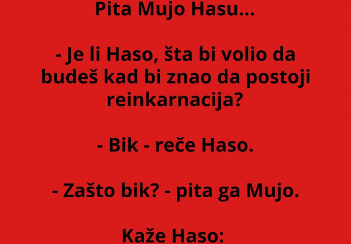 VIC DANA: Pita Mujo Hasu, šta bi volio... Kiosk 24.12.21. 08:38 . Započnite dan nasmijani uz naš vic dana... Pita Mujo Hasu... - Je li Haso, šta bi volio da budeš kad bi znao da postoji reinkarnacija? - Bik - reče Haso. - Zašto bik? - pita ga Mujo. - Pa zato što je on jak ko konj - odgovori Haso.