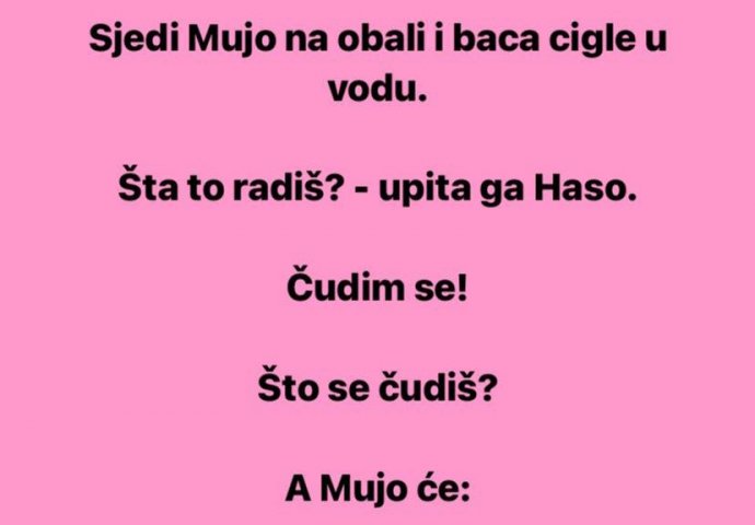 VIC: Mujo se čudi Kiosk 03.01.22. 08:14 Sjedi Mujo na obali i baca cigle u vodu. Sjedi Mujo na obali i baca cigle u vodu. Šta to radiš? - upita ga Haso. Čudim se! Što se čudiš? A Mujo će: Cigla četvrtasta, a kad je bacim u vodu, pojave se krugovi!
