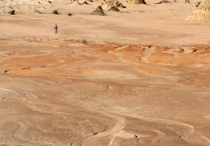 Pozadina: Aboridžini su živjeli na obalama ovih jezera najmanje 50.000 godina, i to područje je jedinstven orijentir u proučavanju ljudske evolucije na australijskom kontinentu. Smatra se da su ostaci skeleta pronađeni u dinama jezera Mugo (na slici) ženski i pri tome još i najstariji ostaci ritualnog kremiranja ikad.