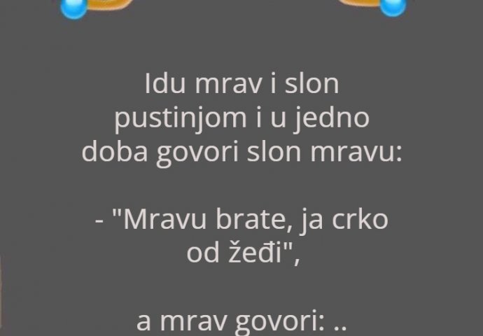 Vic o mravu i slonu u pustinji Kiosk 03.02.22. 10:28 - Idu mrav i slon pustinjom i u jedno doba govori slon mravu: - "Mravu brate, ja crko od žeđi", a mrav govori: - "Ne brini brate ponio sam čuturicu."