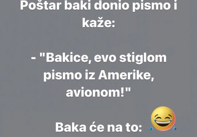 VIC DANA: Pismo baki Kiosk 18.02.22. 08:14 Poštar baki donio pismo i kaže: Poštar baki donio pismo i kaže: - "Bakice, evo stiglom pismo iz Amerike, avionom!" Baka će na to: - "Ne laži, vidjela sam te ja, dosao si na motoru!"