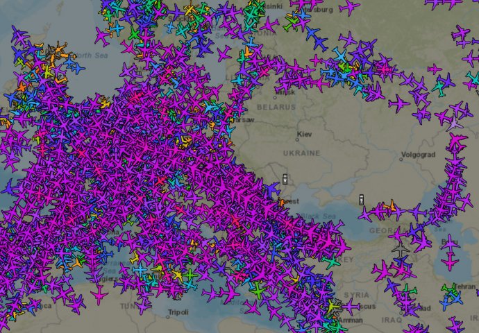 Slike sa ADS-B Exchange ne pokazuju letelice iznad Ukrajine, iako sajt otvorenog koda ne može da prikaže podatke o praćenju aviona koji rade u tom području sa namjerno isključenim emitovanjem lokacije.