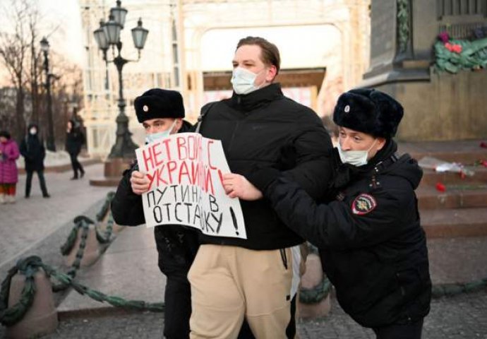 Na slici koju je napravio fotograf AFP-a na mjestu događaja vidi se kako policajci pritvaraju čovjeka koji drži plakat na kojem piše: "Ne ratu s Ukrajinom! Putin da podnese ostavku".