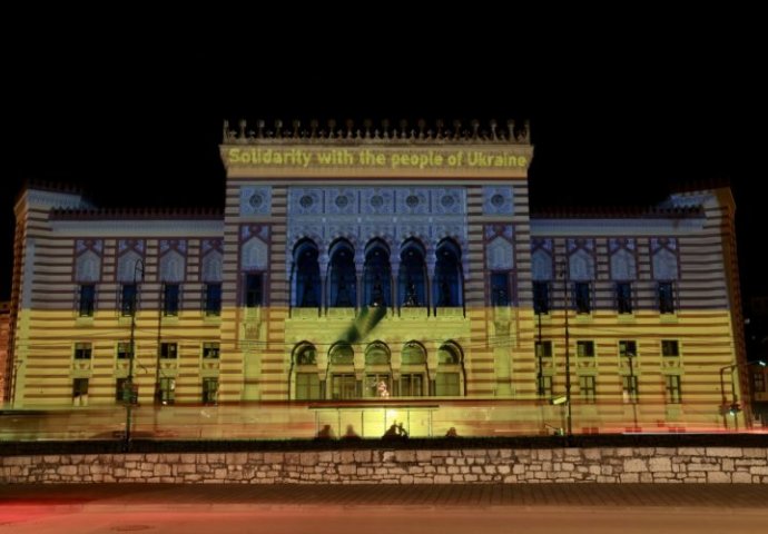 Na Vijećnici je pored boja zastave Ukrajine projektovan i natpis: Solidarnost sa narodom Ukrajine.