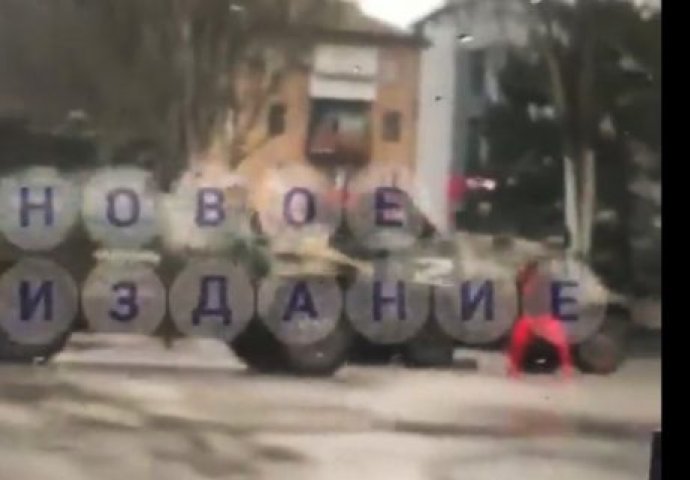 Snimak prikazuje čin hrabrosti ili potpune ludosti jednog državljanin Ukrajine koji tijelom pokušava da zaustavi ruska vojna vozila koja prolaze kroz centar grada Melitopolja.