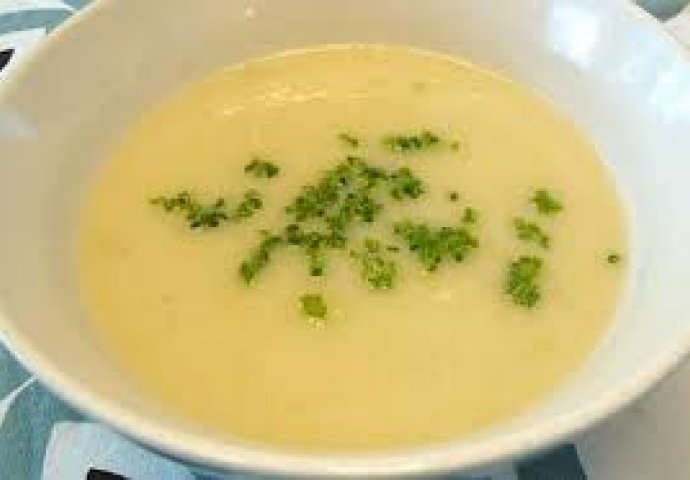 Popržite luk na 30 g maslaca. Dodajte krompir i poriluk te popržite. Ulijte temeljac, posolite, popaprite i kuhajte 30 minuta. Operite kopar, posušite i natrgajte.