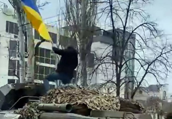 Ukrajinac se u okupiranom Hersonu popeo na ruski oklopnjak i mahao zastavom (VIDEO)