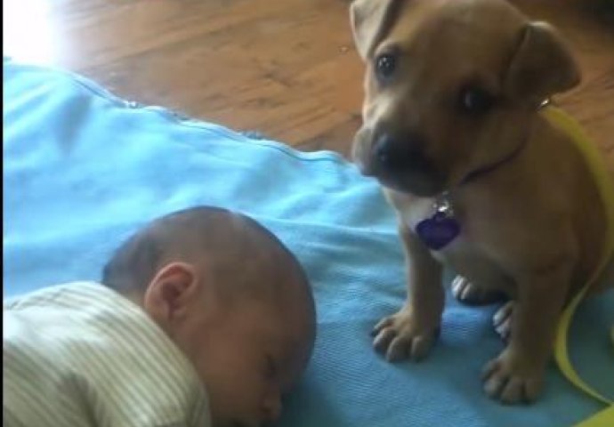 Ovaj odgovorni psić se brine o bebi dok ona spava i iako je i on sam pospan svoju obavezu kao njen anđeo čuvar ne zanemaruje.