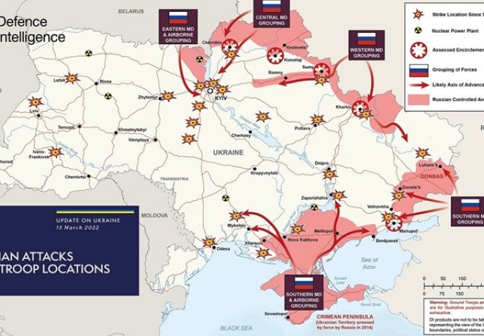 "Ilegalna i ničim izazvana invazija na Ukrajinu se nastavlja. Karta u nastavku je najnovije ažuriranje obavještajne službe o situaciji u Ukrajini - 13. ožujka 2022", stoji u objavi.
