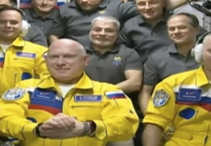 Trojica ruskih kozmonauta koji su danas stigli na Međunarodnu svemirsku postaju nosili su odijela žuto-plave boje, poput boja na ukrajinskoj zastavi, piše Sky News.