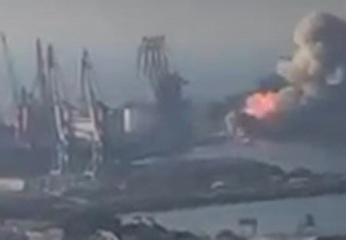 Ruski brod je u luku Berdjansk prevozio oružje i zalihe za snage koje se bore u Mariupolju. Jučer su objavljene dramatične slike vatre i crnog dima nakon što su ukrajinske balističke rakete pogodile brod koji je pristao u luku na Azovskom moru.