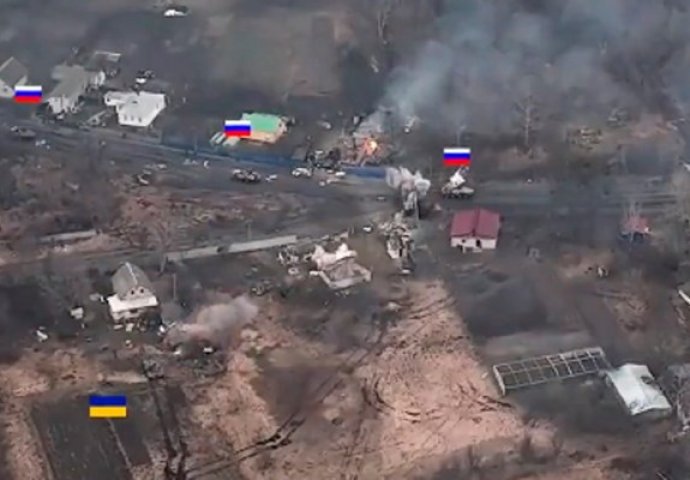 Na snimci koja se masovno dijeli po društvenim mrežama vidi se ukrajinski tenk skriven iza nekoliko građevina, malo dalje od ceste. On otvara vatru na ruske tenkove koji u koloni idu cestom. Jedan tenk na cesti je pogođen, kako se čini. U prvom trenutku tenkovi s ceste nisu ni znali odakle se na njih puca, a onda su samo nastavili svoj put.