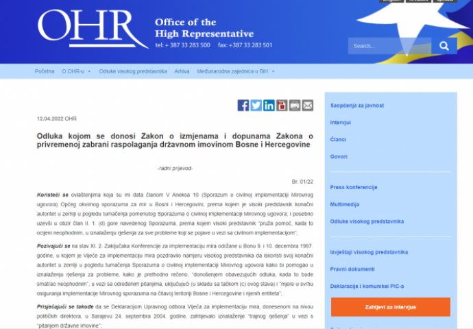 Visoki predstavnik u Bosni i Hercegovini Christian Schmidt danas je donio Odluku kojom se donosi Zakon o izmjenama i dopunama Zakona o privremenoj zabrani raspolaganja državnom imovinom Bosne i Hercegovine. Njom je suspendovao Zakon o nepokretnoj imovini RS. Odluka je stupila na snagu jer je objavljena na stranici OHR-a.
