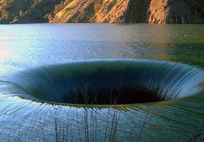 Ovo je jezero Berryessa u Kaliforniji i odvod kontrolira razinu vode u jezeru. Ovaj odvod toliko je velik da može da proguta kuću. Širok je 70 metara i dubok je gotovo 300 metara.