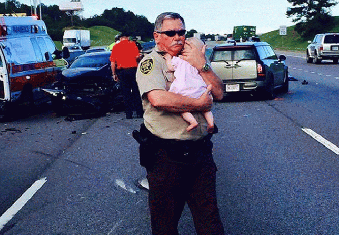 Policajac koji drži bebu je zapravo šerifov zamjenik Ric Lindley i došao je na mjesto gdje se dogodila teška saobraćajna nesreća u kojoj su se sudarili vozilo hitne pomoći, traktor i tri autmobila.