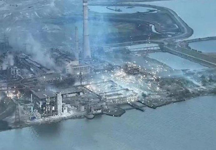 Snimka iz zraka koja je u nedjelju objavljena na društvenim mrežama prikazuje napad na tvornicu, gdje ukrajinski vojnici vode borbu protiv ruskih snaga koje nastoje osvojiti njihove posljednje uporište čeličanu Azovstal.