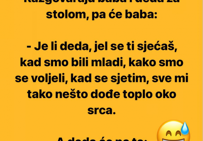 Razgovaraju baba i deda za stolom, pa će baba: