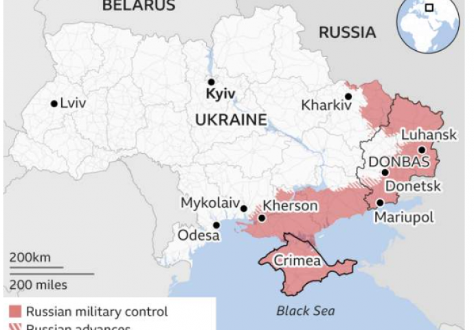 Ali Rusija sada kontroliše polumjesec ukrajinske teritorije koji se proteže oko drugog ukrajinskog grada Harkova, nastavlja se kroz gradove Donjeck i Lugansk koje drže separatisti i seže na zapad do Hersona, formirajući kopneni most koji povezuje poluostrvo Krim (nasilno pripojen Rusiji u 2014) sa regijom Donbas.