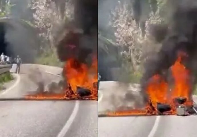 Kako se saznaje motociklista je prevezen u bolnicu u Foči, a snimak prikazuje kako motocikl gori na sred ceste.