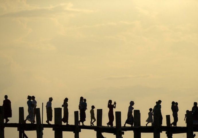Ove fotografije će vam dočarati koliko je svijet prelijepo i šareno mjesto Zanimljivosti 12.10.15. 10:02 Vodimo vas na kratki put oko svijeta. Šetnja po mostu Ljudi prelaze U Bein most preko Tuangthaman jezera u Myanmaru. Most je dugačak skoro 1200 metara, a izgrađen je 1850. godine.