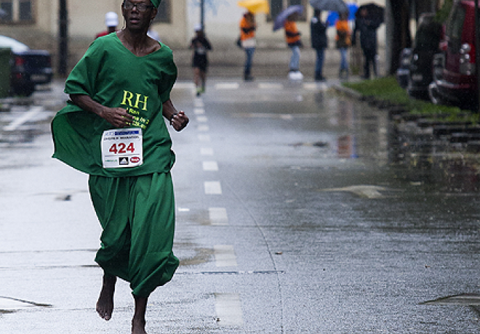 Među 2000 maratonaca koji su jučer istrčali Zagreb maraton pozornost je najviše plijenio upravo on, francuski diplomat Sidy Diallo, koji je unatoč pljusku cijelu dionicu od 42 kilometra istrčao potpuno bos i odjeven u široku afričku odjeću.