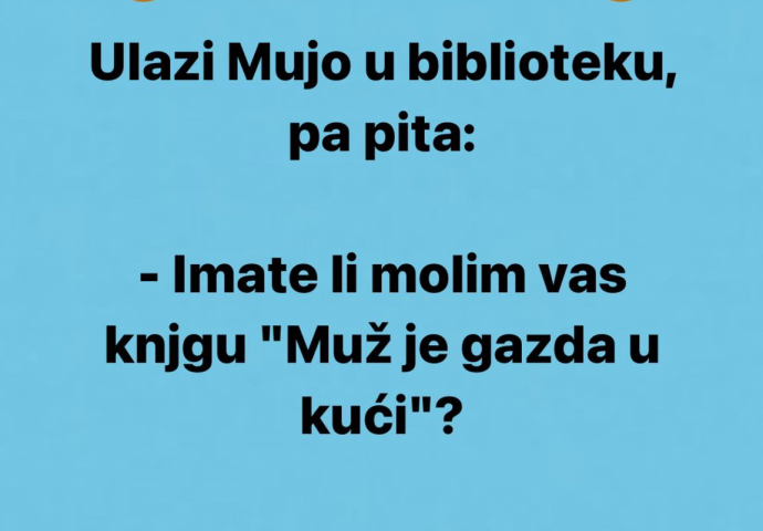VIC DANA: Ulazi Mujo u biblioteku Kiosk 22.07.22. 18:10 Ulazi Mujo u biblioteku, pa pita: Ulazi Mujo u biblioteku, pa pita: - Imate li molim vas knjgu "Muž je gazda u kući"? A bibliotekarka će na to: - Žao mi je gospodine, bajke ne držimo.